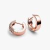 Add a touch of sparkle to your everyday look with our hand-finished brand Timeless Pavé Double-row Hoop Earrings. Featuring 14k rose gold plating, the front of each slightly squared hoop is set with two rows of clear c