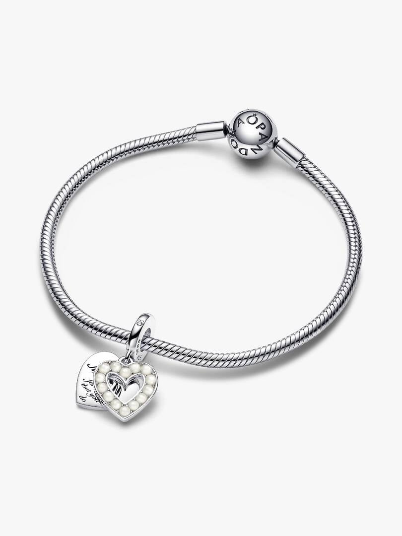 An elegant gift for a mom who loves pearly tones. The Pearlescent White Heart Double Dangle Charm is crafted from sterling silver and features a cut-out heart shape adorned with a row of bioresin man-made mother of pearl