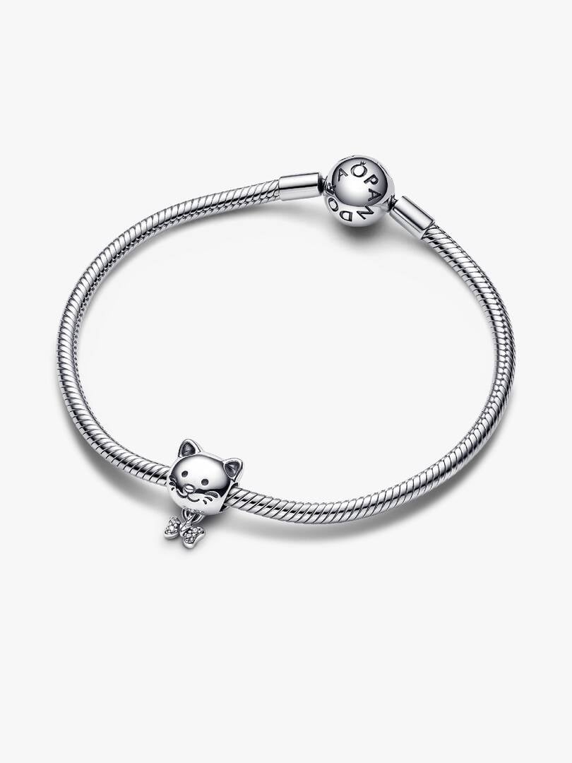 Let your love for your feline bestie shine with the Pet Cat & Bow Charm. Crafted from sterling silver, this retro piece with a modern touch is decorated with engraved lines on the face and sparkling pavé on the bow dangl