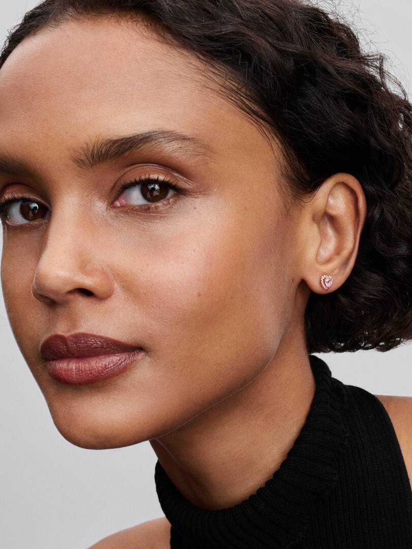 Add a romantic touch to your look with the Pink Elevated Heart Stud Earrings. Heart-shaped pink stones take center stage in this set of 14k rose gold-plated earrings. A sparkling pavé border further accentuates the eleva
