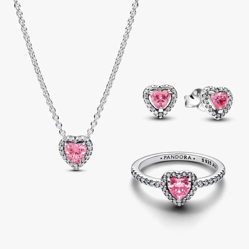 The Pink Hearts Jewelry Set radiates love. Featuring a sterling silver necklace with a pink heart pendant, matching stud earrings, and a pavé-detailed ring, it’s the perfect reminder to share love.