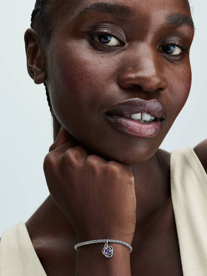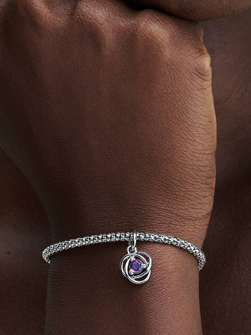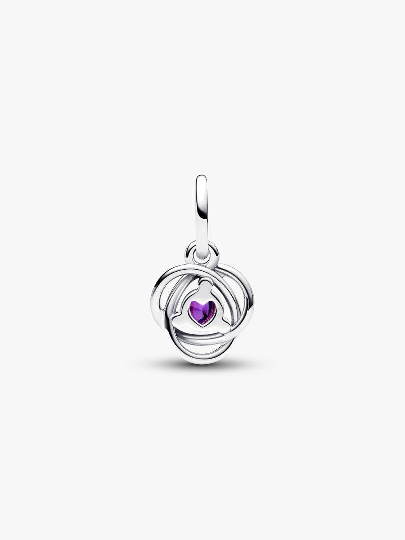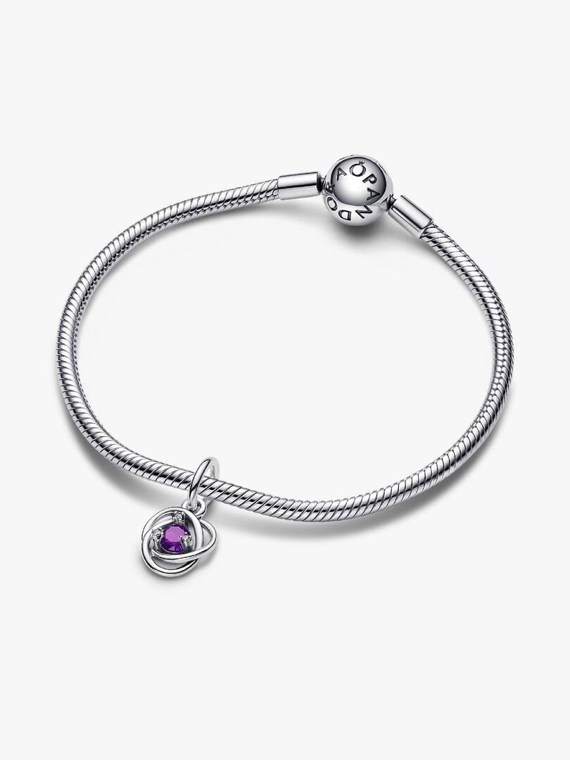 This intricate Purple Eternity Circle Dangle Charm is a must-have infinity charm for your brand Moments collection. Crafted in lustrous sterling silver, it features an openwork infinity braid decorated with a central p