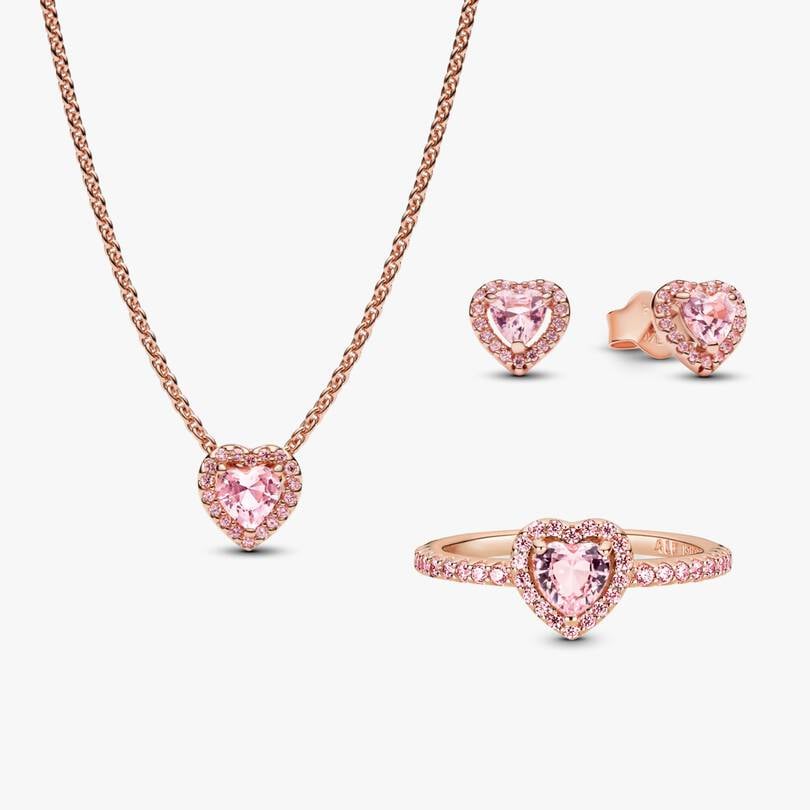 The Rose Gold Heart to Heart Set includes the Pink Elevated Heart Stud Earrings, Heart Collier Necklace, and Sparkling Elevated Heart Ring, each featuring pink stones and pavé accents for a romantic, vibrant look.