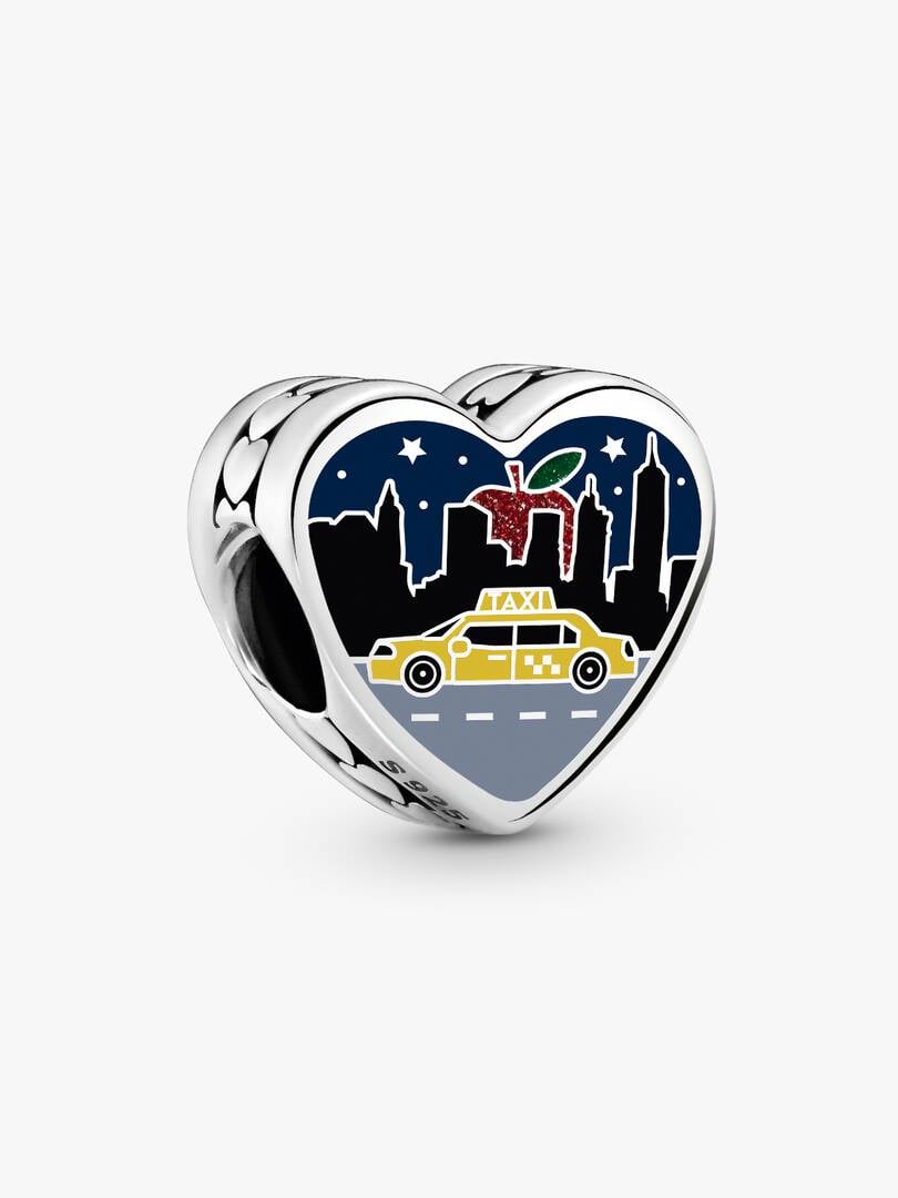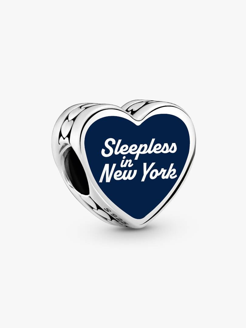 fe. One side showcases the iconic NYC skyline with a classic yellow taxi and a bright red apple—a nod to the city’s nickname. Flip it over to reveal a blue heart inscribed with “Sleepless in New York,” celebrating the city’s vibrant energy. Framed with a string of connecting hearts, this charm is the perfect souvenir to remember your NYC adventure.