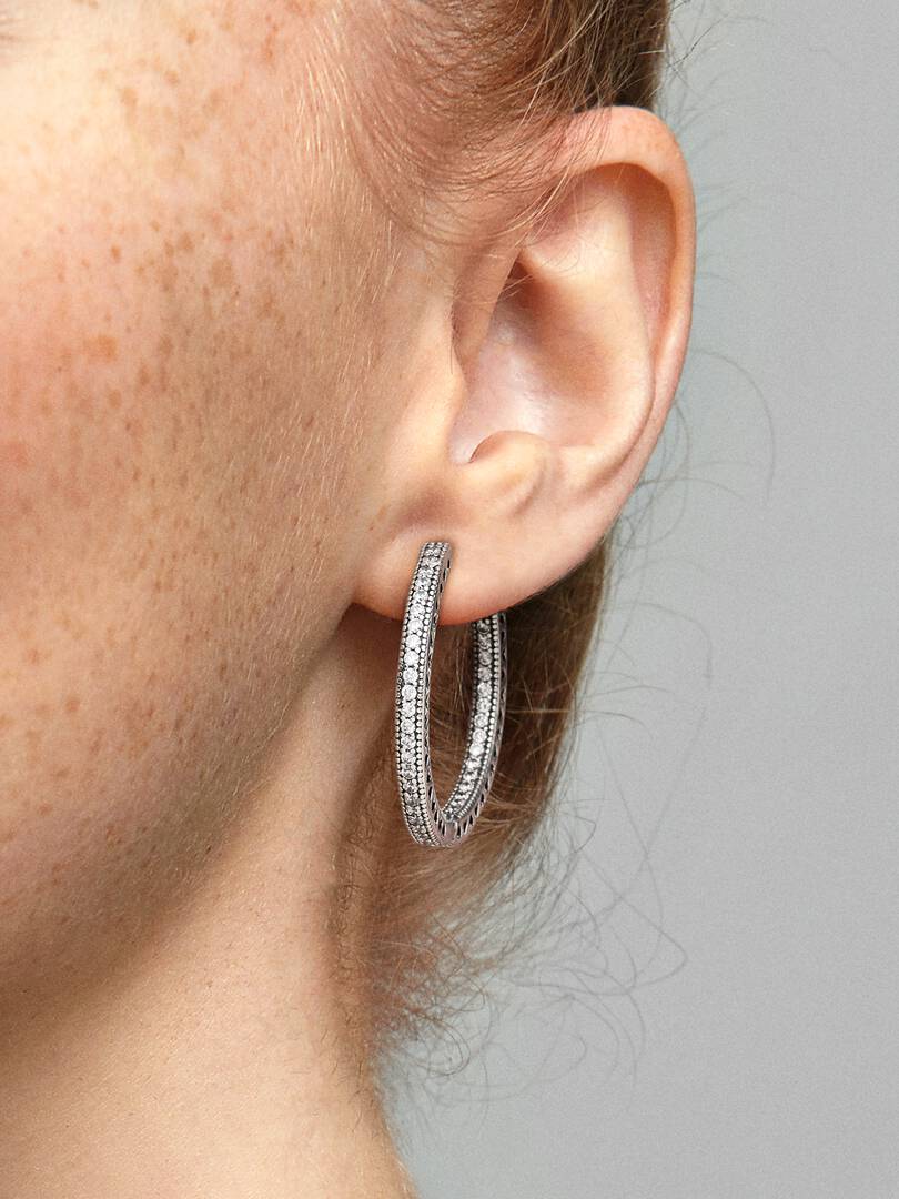 Classic, yet contemporary. Cute, yet cool. Curving around your ear to create an elegant look, this pair of hoop earrings is crafted from sterling silver. They’re studded with cubic zirconia and subtly detailed with our s