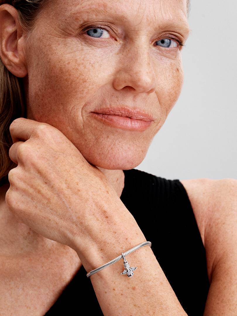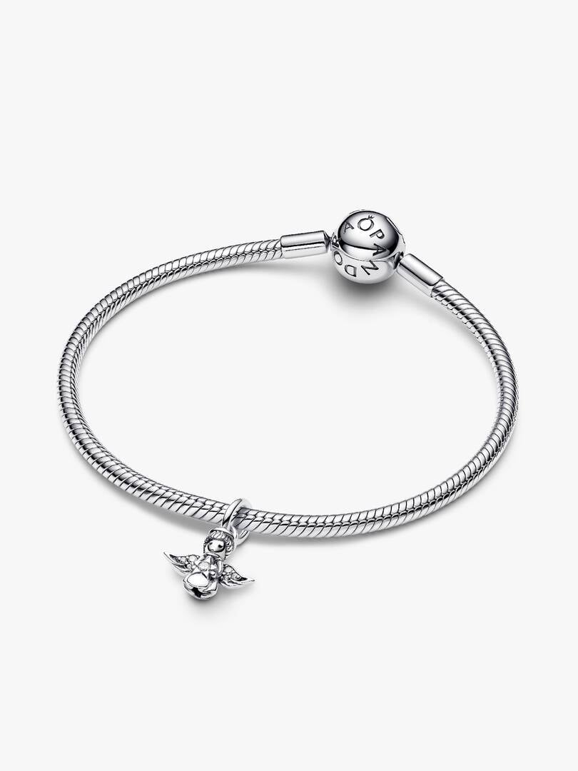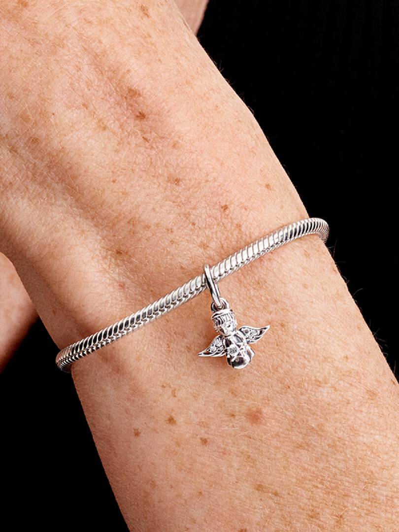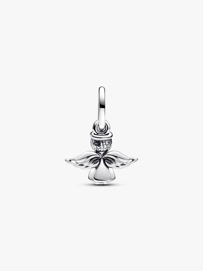 Carry the joy and wonder of the season with our Sparkling Angel Dangle Charm. A sterling silver angel with sparkling stone-set wings carries a sparkling star, shining its festive light for the holidays and beyond. Carry