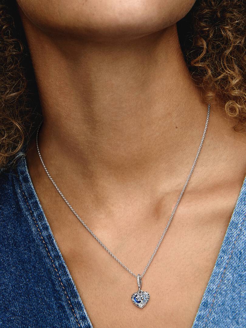 Celebrate the beautiful night sky with the Sparkling Blue Moon & Stars Heart Necklace. Hand-finished in sterling silver, this heart-shaped pendant is decorated with blue stones, silver stars and features a half-moon ston