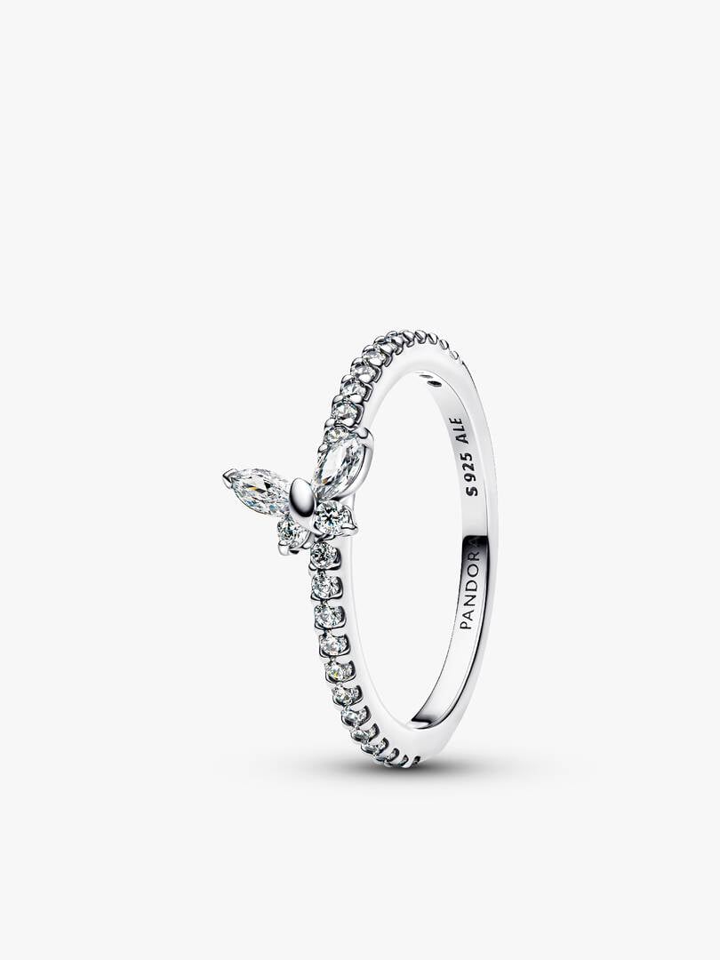Add subtle sparkle to your look. This sterling silver ring features clear cubic zirconia with a butterfly set at an angle as a symbol of transformation and beauty.