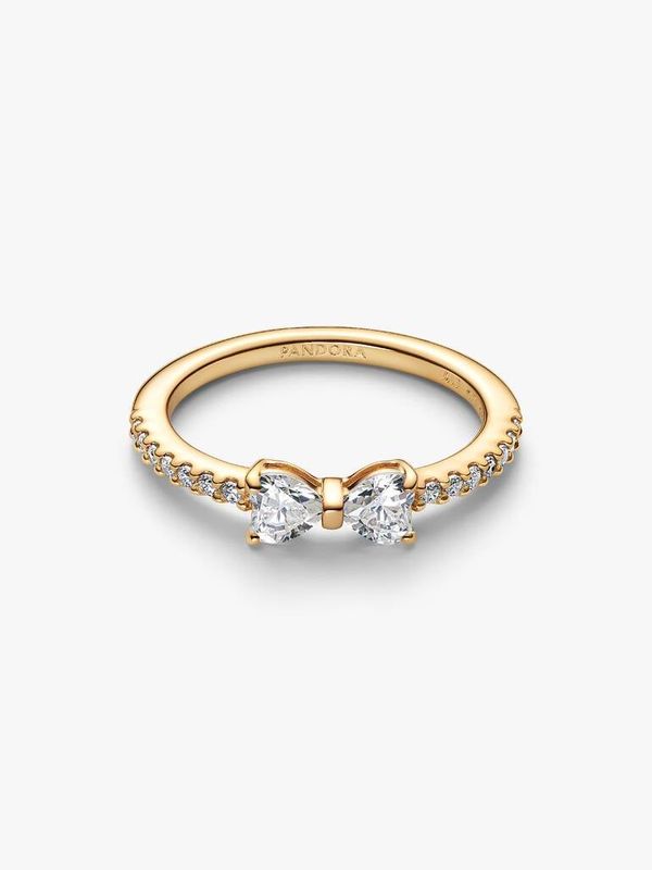 A dainty bow design formed by two heart-shaped stones sits at the centre of this sparkling ring, blending sweetness and elegance for a striking look.