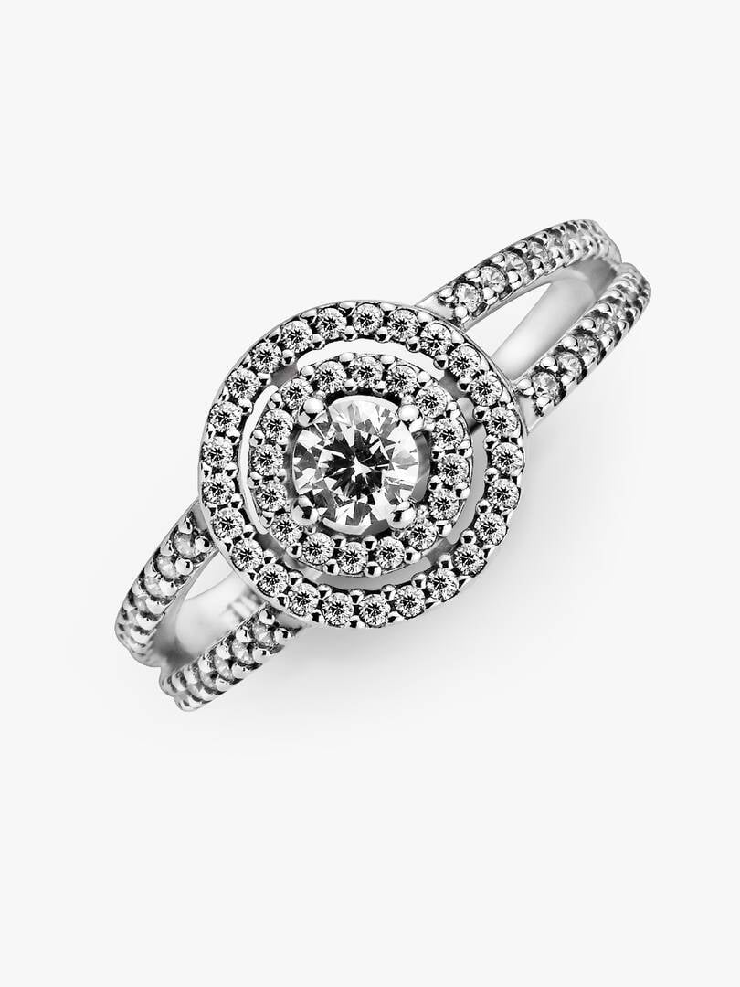 Give the gift of classic style with the Sparkling Double Halo Ring. Hand-finished in sterling silver, this shimmering piece is decorated with clear cubic zirconia. The statement centerpiece features one big, raised centr