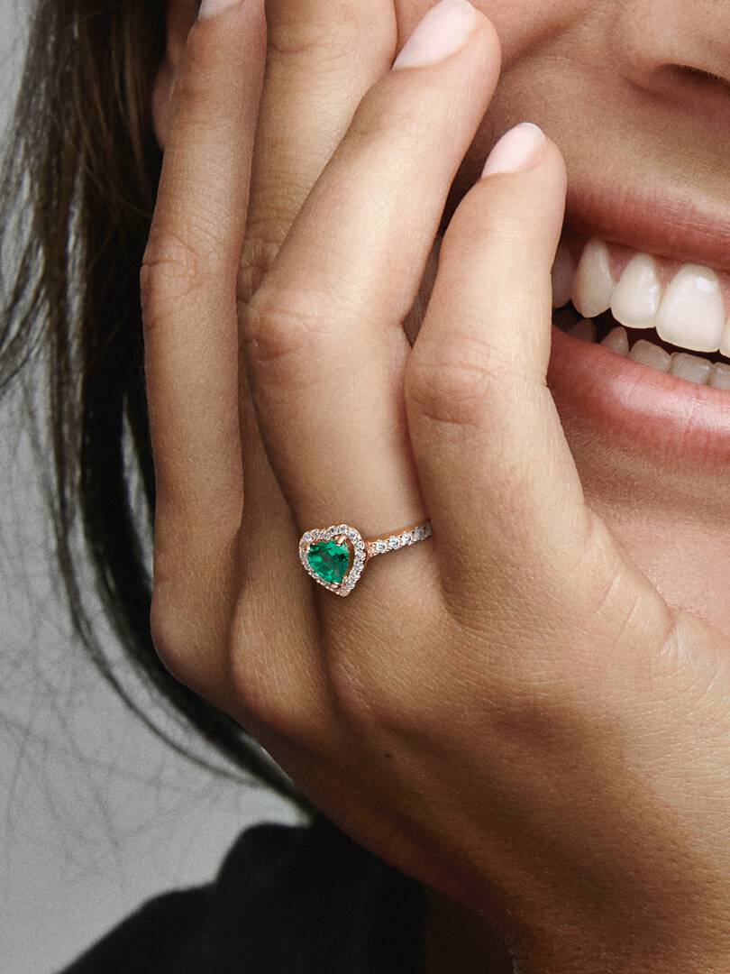 es a green heart-shaped central, elevated stone. Clear cubic zirconia create the halo and decorate half of the ring band, with the brand logo inside the shank. Stack this ring with hand-finished styles in sterling silver for a statement mixed metal look.