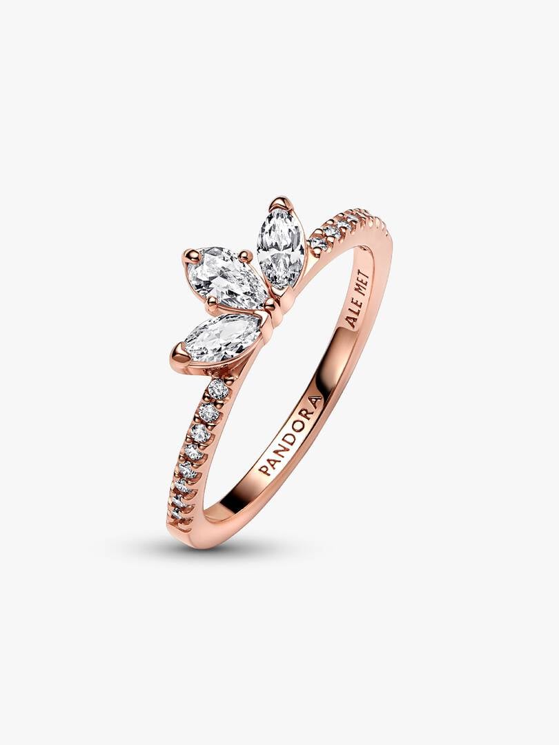 Our Sparkling Herbarium Cluster Ring features three central stones in a petal shape, two marquise-shaped and one pear-shaped. Finished in 14k rose gold plating, this elegant ring is inspired by the beauty of nature, with