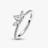 Our Sparkling Herbarium Cluster Ring features three central stones in a petal shape, two marquise-shaped and one pear-shaped. Crafted from sterling silver, this elegant ring is inspired by the beauty of nature, with peta