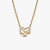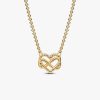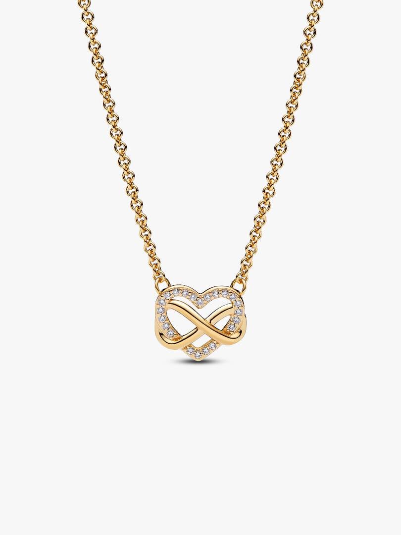 Plated with 14k gold, the Sparkling Infinity Heart Collier Necklace is a versatile piece perfect for special occasions as well as everyday wear. The openwork heart pendant, adorned with 22 brilliant-cut cubic zirconia st