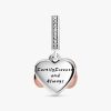 lear cubic zirconia. The back dangle’s pink hand-applied enamel provides a sweet backdrop to the love-filled message of the dangle charm with the engraving “Family forever and always”.
