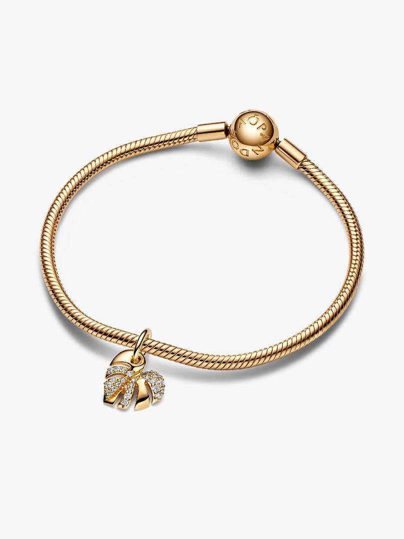Wear an ode to nature with the Sparkling Monstera Leaf Dangle Charm. This 14k gold-plated leaf charm features one side covered in sparkling pavé, while the other side has realistic embellishments such as the ribs and vei