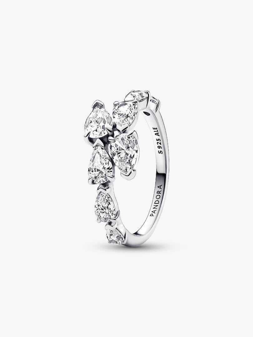 Wrap yourself in sparkling style with the Sparkling Overlapping Band Ring. This sterling silver ring features four pear-shaped stones on each overlapping end. V-shaped prongs at the tip of each stone emphasise the pear s