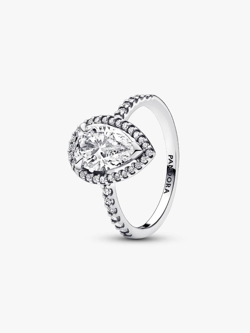 Shine brighter than ever when you wear the Sparkling Pear Halo Ring. This sterling silver ring features one striking pear-shaped stone set slightly above a delicate pavé halo. A V-shaped prong and two claw prongs hold th