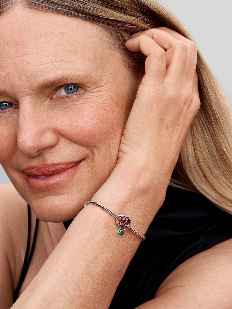 flect the beauty of a rose in bloom and is covered with red man-made crystals. To lend an air of life-like details and movement, two green stones dangle beneath the flower representing leaves. Perfect as a gesture of love for someone close or as a meaningful addition to your collection, this brand rose charm is sure to keep the romance alive.