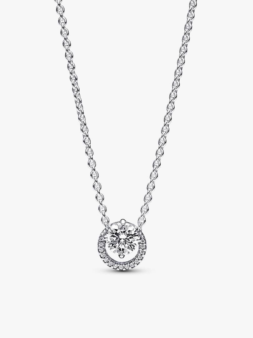 ng cubic zirconia, these earrings capture the everlasting symbolism of circles. The sterling silver Sparkling Round Halo Pendant Collier Necklace, adorned with clear cubic zirconia, represents the enduring beauty of circles. The pendant features an off-centre, prong-set round stone that delicately overlaps a pavé halo, allowing it to slide freely along the adjustable 38 cm, 42 cm, or 45 cm cable chain. With an engraved brand logo and a dangling stone by the lobster clasp, this necklace adds sophistication to any look. The design, inspired by brand Timeless motifs, seamlessly blends classic beauty with giftable elegance.