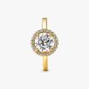 Classic yet modern, the 14k gold-plated Sparkling Round Halo Ring features a round center stone encircled by a halo of brilliant-cut clear cubic zirconia pavé. The brand logo is engraved on the inside of the shank. A t