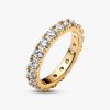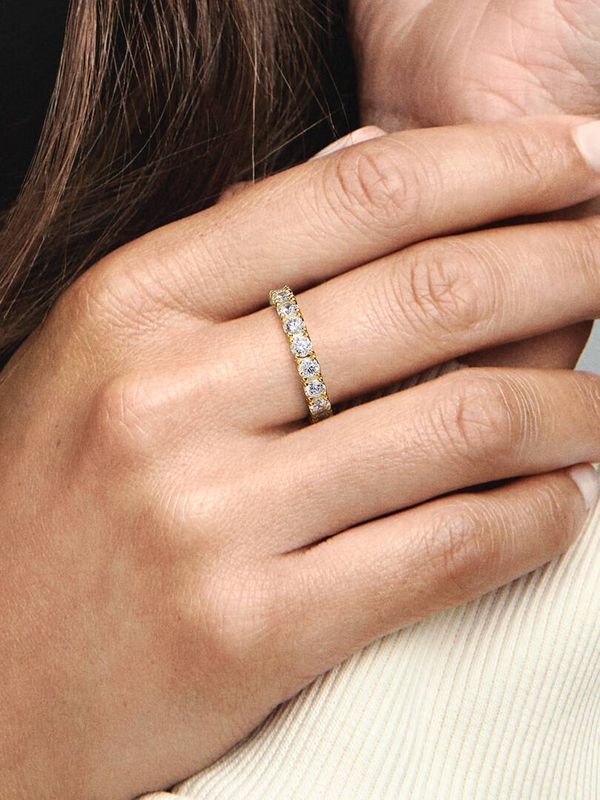 Make a classic statement with the Sparkling Row Eternity Ring. Hand-finished in 14k gold-plated sterling silver, this eternity ring features a band inlaid with sparkling clear cubic zirconia. The design looks equally bea