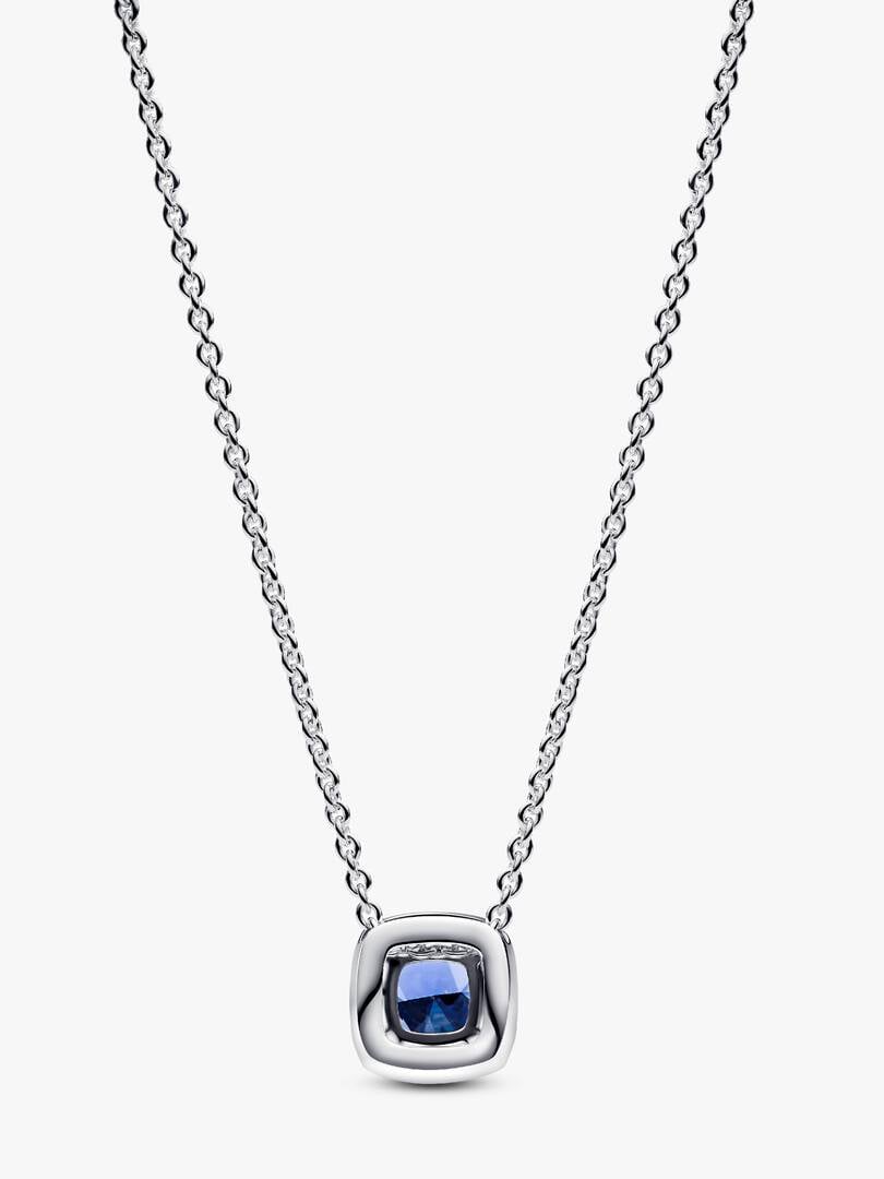 Add deep blue to your look with this statement necklace crafted from sterling silver. Featuring a blue crystal encircled by a squared halo of pavé cubic zirconia, this piece effortlessly blends modern and classic design.