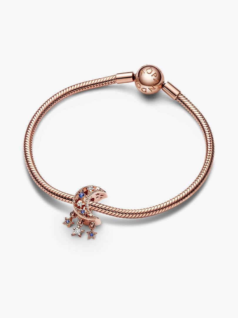 Add celestial sparkle to any look with the Star & Crescent Moon Charm. Finished in 14k rose gold plating, the charm has been carefully detailed by hand with rows of cubic zirconia and cut-out star and circle shapes. Micr
