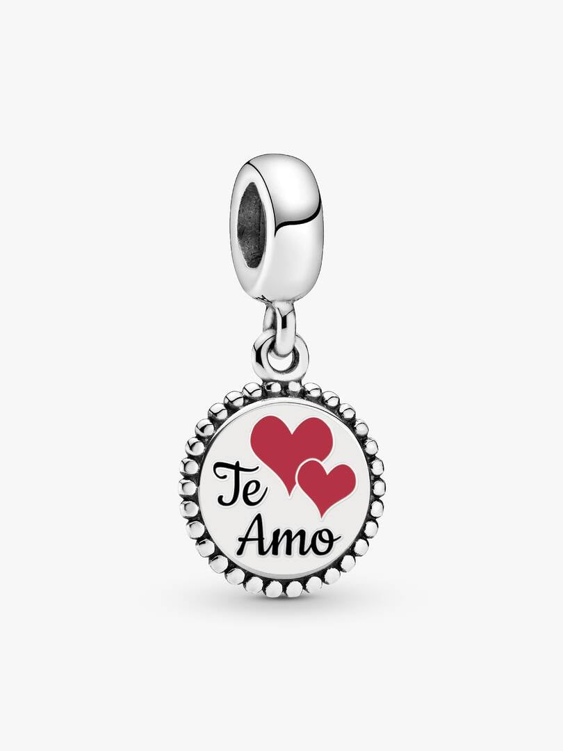 Express your love with the Te Amo Dangle Charm. Crafted in sterling silver, this charming piece features “Te Amo” inscribed in bold black lettering, a beautiful declaration of love in Spanish. Two overlapping red hearts