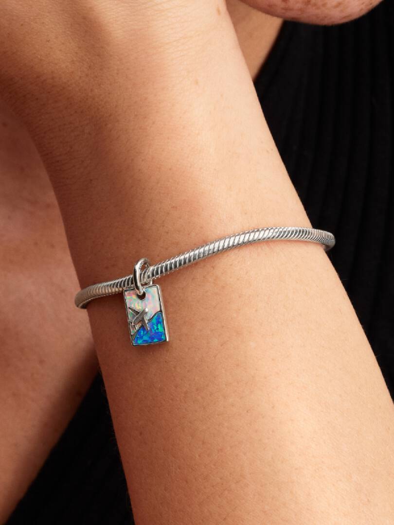 Explore the world with a symbol of freedom and adventure. This travel-themed charm is designed to inspire your journey, with a unique blend of white and blue lab-created opal.