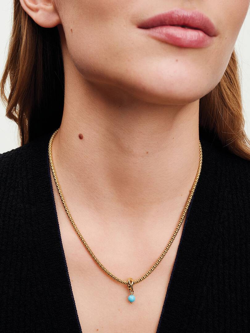 Wear a symbol of forever, that’s personal to you. This 14k gold-plated dangle charm is made up of a triple knotted circle that intertwines to resemble an infinity sign. The twist carries a faceted capri blue man-made cry