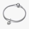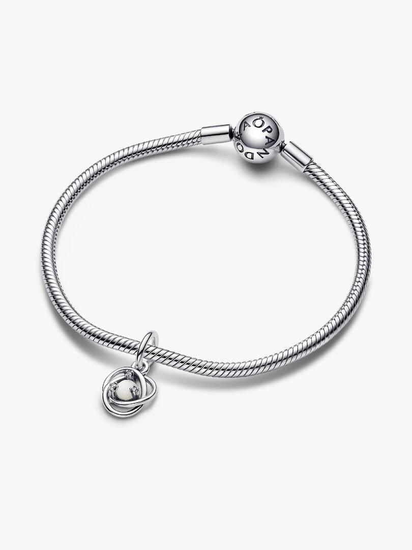 This intricate White Eternity Circle Dangle Charm is a must-have for your brand Moments collection. Crafted in lustrous sterling silver, it features an openwork infinity braid decorated with a central white bioresin ma