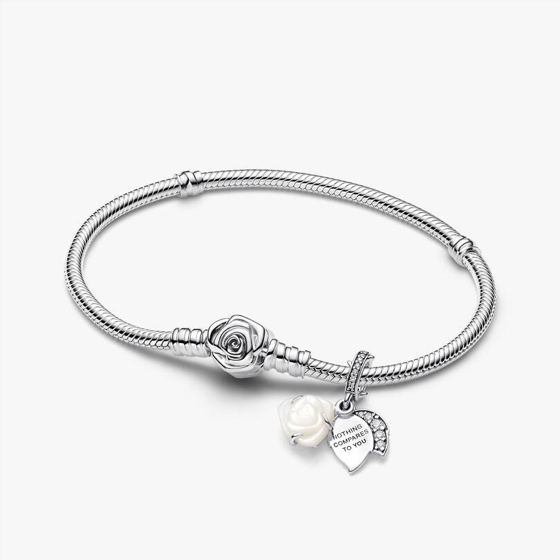 terpiece is the split dangle charm, boasting a delicate rose crafted with white bioresin man-made mother of pearl. Featuring a heartfelt inscription “Nothing Compares to You” and sparkling clear cubic zirconia, this set is a delightful gift for someone special or a lovely addition to your own collection. Reminding you that true beauty is both inside and out, this set is made for you.